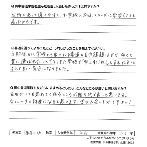 先生がいつも褒めてくれるところが魅力的で良いと思います。字は一生の財産になると思います!ぜひ入会してみてください!