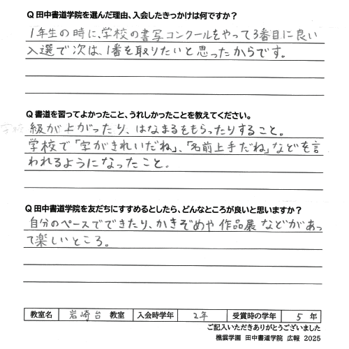 1年生の時に、学校の書写コンクールをやって3番目に良い入選で、次は1番を取りたいと思ったからです。