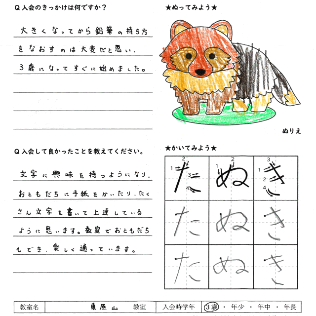 文字に興味を持つようになり、おともだちに手紙をかいたり、たくさん文字を書いて上達しているように思います。教室でおともだちもでき、楽しく通っています。